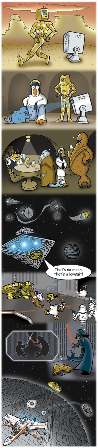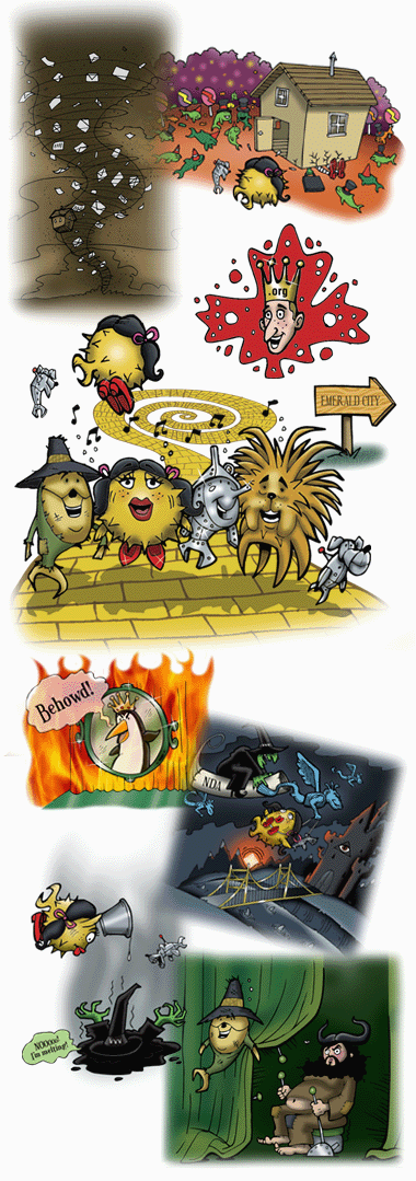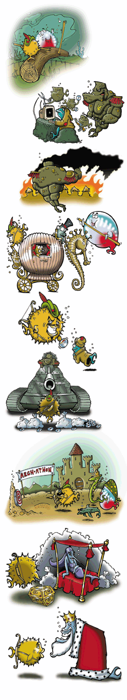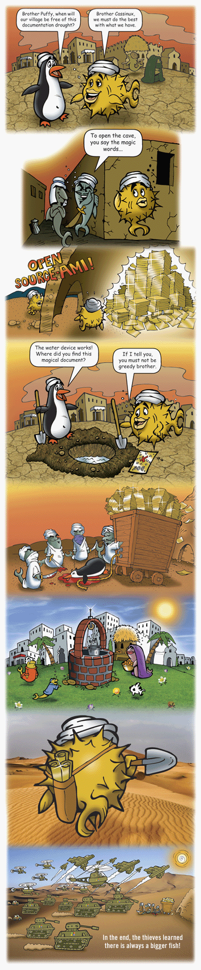 Join Puffy Hood and his Funny Fish as they take on the Sheriff (an unelected leader) and other evil forces of the draconian government! As we did for the 3.3 release, we have once again tried making release artwork and music which are allegorical of recent happenings. Two years ago we became involved with the University of Pennsylvania and DARPA, who were funding us to do security research and development .. on things that we were already intending to do. We provided ideas, wrote papers, and deployed cutting-edge technology; DARPA provided finances and reaped a share of the credit, and the University of Pennsylvania acted as a middle-man. We accepted funding based on the promise that our freedom to operate as we wished was unaffected. To us, freedom is more important than funding — heck, we were dealing with the evil forces of government, and needed to be careful. A few months prior to this release, DARPA suddenly and without warning decided to withdraw that funding; they also aggressively backed out of contractual obligations. Many articles in the press followed regarding this sudden maneuver. Apparently this hoopla happened because an OpenBSD-related article in the Canadian newspaper The Globe & Mail had quoted Theo de Raadt making anti-war statements regarding Iraq and the theft of oil. The only answer given (to major media reporters) by a DARPA spokesperson (Jan Walker) was this: "As a result of the DARPA review of the project, and due to world events and the evolving threat posed by increasingly capable nation-states, the Government on April 21 advised the University to suspend work on the "security fest" portion of the project." That almost toes the line of calling us terrorists! We had lost financial support, but the release of the statement above suddenly made us very happy to be free of any perceived obligation to such crazy people. Since the termination came near natural contract termination (about 4 months remained), less damage than expected was sustained by the project. Sponsors stepped forward and helped us make up the missing funds we needed to run our "Hackathon", and the event proceeded as planned. We even had T-shirts made with "Workstations of Mass Development" artwork for those developers who attended (sorry, they are not for sale). We could not make stories like this up. So instead, we are making up an allegory about it, using the tale of Robin Hood. |